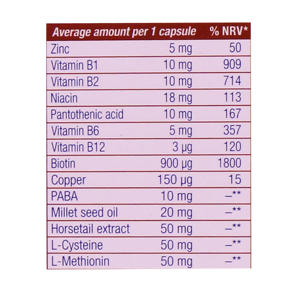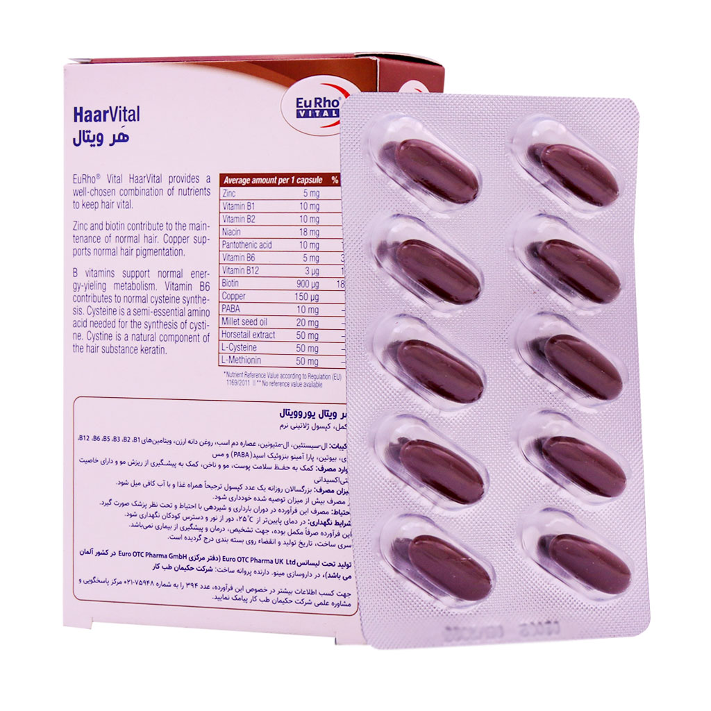 کپسول هر ویتال یوروویتال حاوی آمینو اسید های ضروری، عصاره گیاه دم اسبی، روغن دانه ارزن، پابا و ویتامین های گروه B و زینک و … به سلامت پوست، مو و ناخن کمک موثری می کند.